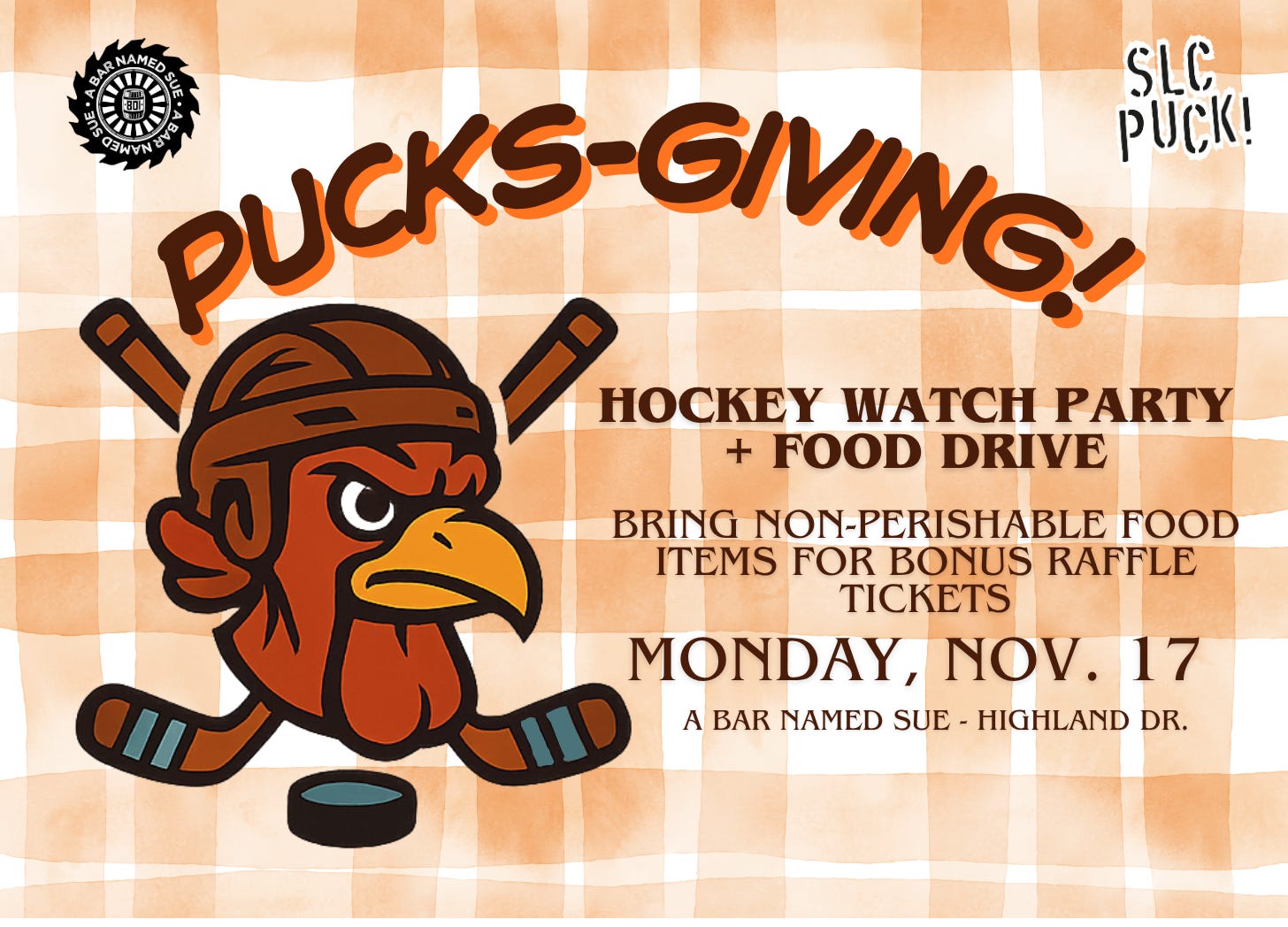 Weβre turning it into a Pucks-Giving Food Drive to benefit the Utah Food Bank. Bring any non-perishable food items and youβll snag bonus raffle tickets for our free giveaways during intermissions. Show up, yell at the power play with your people, and do some good at the same time.