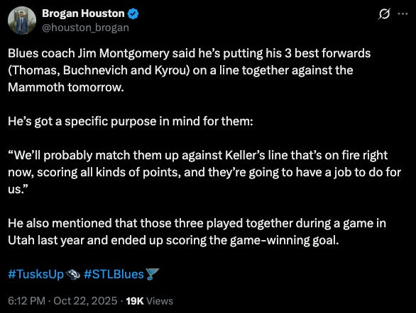 Before Utah’s 7–4 win in St. Louis, Blues head coach Jim Montgomery vowed to emphasize the Keller–Schmaltz–Hayton line. He also made a—let’s call it creative—choice to sit Jordan Binnington against a Central foe riding a four-game heater.